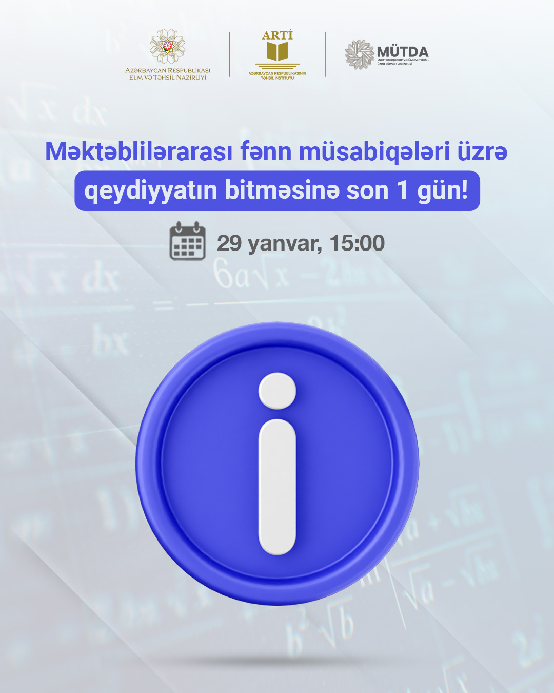Müsabiqədə iştirak etmək istəyən şagirdlər 29 yanvar saat 15:00-dək https://portal.edu.az/ platforması üzərindən “Müsabiqələr və olimpiadalar” bölməsinə daxil olaraq, müvafiq müsabiqə istiqamətini seçməklə elektron müraciət etməlidirlər.