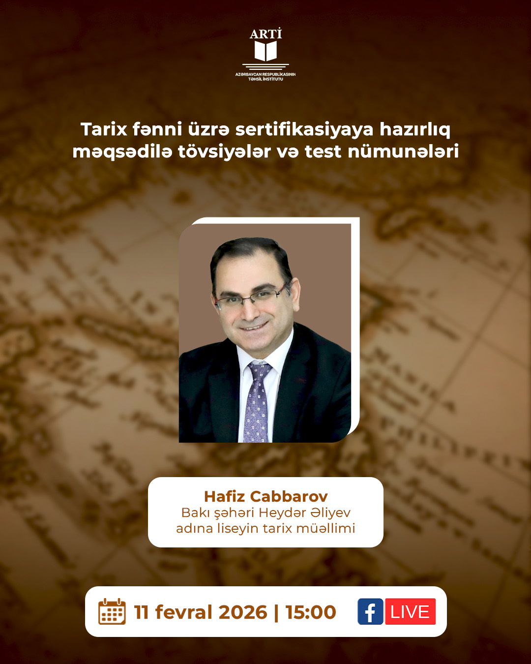 ARTİ tərəfindən təhsilverənlərin sertifikatlaşdırılması prosesinə dəstək məqsədilə 11 fevral, saat 15:00-da “Tarix fənni üzrə sertifikasiyaya hazırlıq məqsədilə tövsiyələr və test nümunələri” mövzusunda vebinar keçiriləcək.