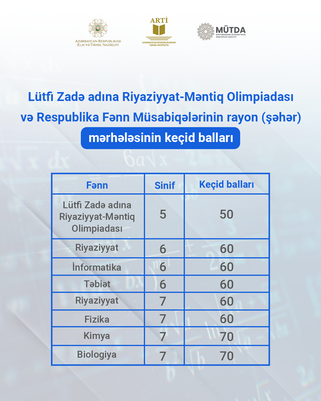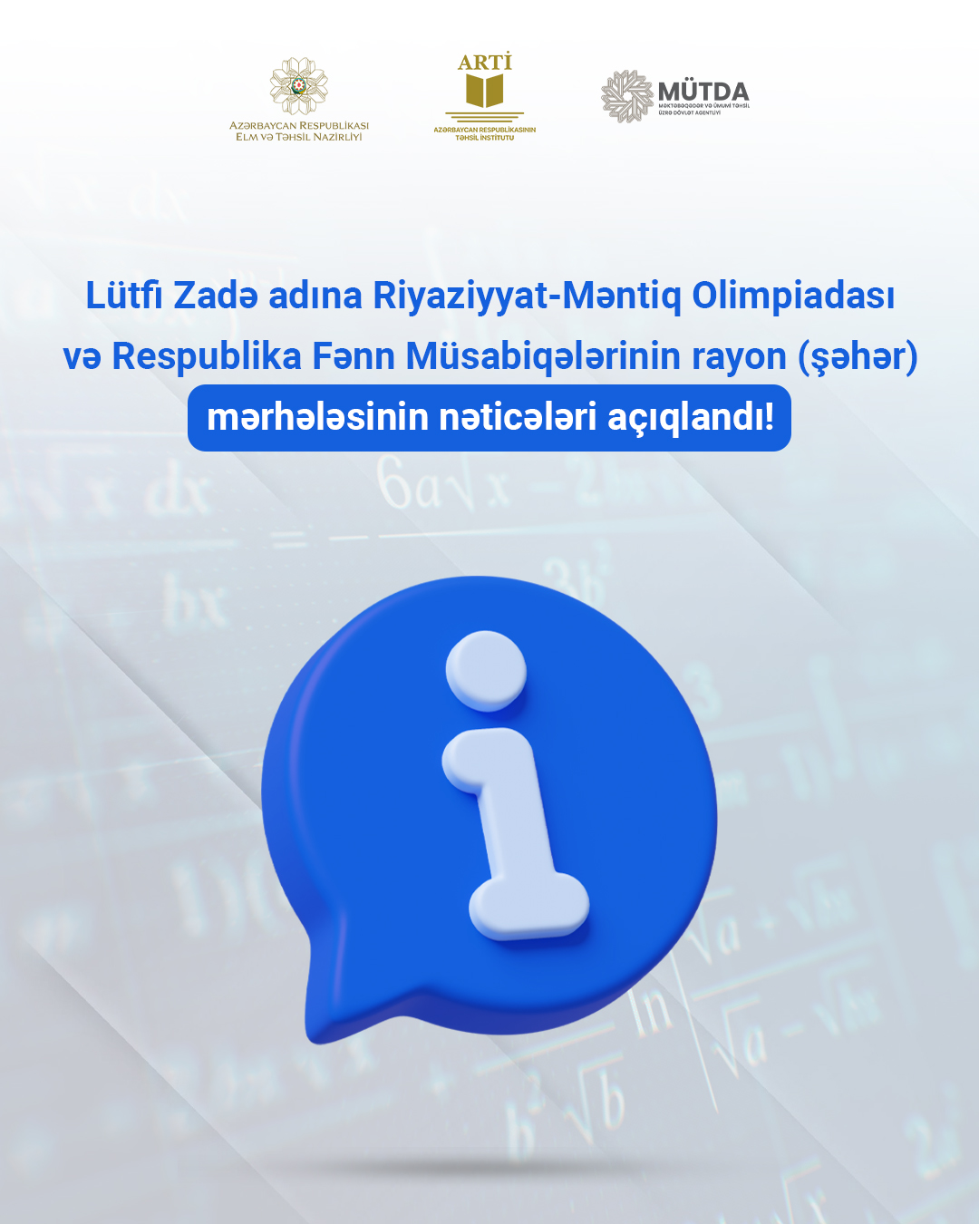 Lütfi Zadə adına Riyaziyyat-Məntiq Olimpiadası və Respublika Fənn Müsabiqələrinin rayon (şəhər) mərhələsinin nəticələri elan olunub. Şagirdlər www.portal.edu.az saytındakı şəxsi kabinetlərinə daxil olaraq öz nəticələri tanış ola bilərlər.