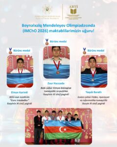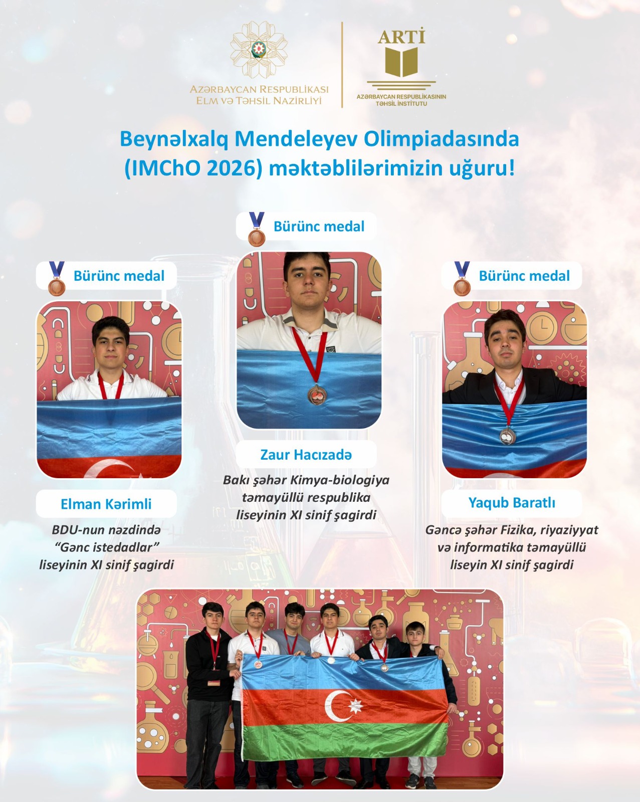 Rusiyanın Moskva şəhərində keçirilən 60-cı Beynəlxalq Mendeleyev Olimpiadasında şagirdlərimiz 3 bürünc medal qazanıblar. 35 ölkədən 200 məktəblinin iştirak etdiyi bu nüfuzlu müsabiqədə Bakı şəhər Kimya-biologiya təmayüllü respublika liseyinin 11-ci sinif şagirdi Zaur Hacızadə, BDU-nun nəzdində “Gənc istedadlar” liseyinin 11-ci sinif şagirdi Elman Kərimli və Gəncə şəhər Fizika, riyaziyyat və informatika təmayüllü liseyin 11-ci sinif şagirdi Yaqub Baratlı fərqləniblər.