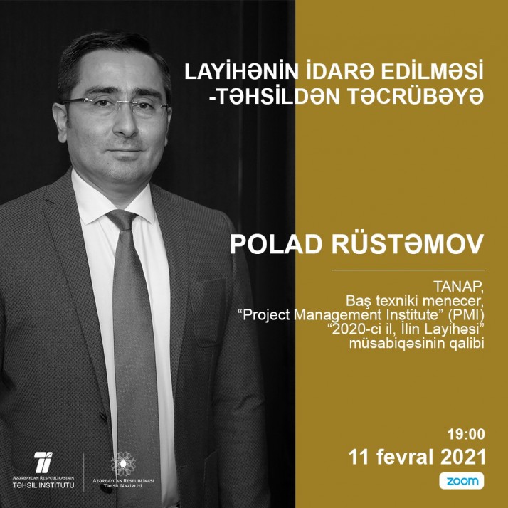 “İş dünyası və ali təhsildə trendlər” onlayn vebinarlar silsiləsinin “Layihənin İdarə Edilməsi - Təhsildən Təcrübəyə” adlı ikinci tədbiri Azərbaycan Respublikasının Təhsil İnstitutunun təşkilatçılığı ilə 11 fevral saat 19:00-da baş tutacaqdır. Tədbirin məqsədi sənayenin tələblərindən biri olan layihə idarəçiliyinin əsasları haqqında məlumat vermək və ali təhsil müəssisələri tərəfindən müvafiq bacarıqların tədris prosesində inkişaf etdirilməsi yollarını müzakirə etməkdən ibarətdir. Təqdimatı bu sahədə böyük müvəffəqiyyət əldə etmiş və rəhbəri olduğu TANAP layihəsinin Layihələrin İdarəolunması İnstitutu (“Project Management Institute” (PMI)) tərəfindən “2020-ci il, İlin Layihəsi” mükafatı alan Polad Rüstəmov aparacaqdır. Aşağıda onun barəsində əlavə məlumat öz əksini tapmışdır: