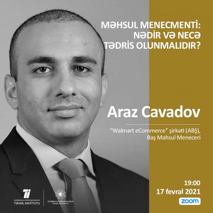 “İş dünyası və ali təhsildə trendlər” onlayn vebinarlar silsiləsinin “Məhsul menecmenti: nədir və necə tədris olunmalıdır?” adlı üçüncü tədbiri Azərbaycan Respublikasının Təhsil İnstitutunun təşkilatçılığı ilə 17 fevral saat 19:00-da baş tutacaqdır. Tədbirin məqsədi iş dünyasında tələb olunan yeni peşələrə diqqət çəkmək və onlara ali təhsil müəssisələrinin necə hazırlanmasını müzakirə etməkdən ibarətdir. Təqdimatı ABŞ-da “Walmart” şirkətinin e-kommersiya qolunun baş məhsul meneceri olan Araz Cavadov aparacaqdır. O, Üzvlük və marketinq şöbəsində satış platformasının əsasını təşkil edən Üzvlük platformasının məhsul meneceridir. Əlavə olaraq, yeni istifadəçilərin alınması və mövcud istifadəçi bazasının artırılması üçün Marketinq şöbəsi ilə birgə yeni məhsulların inkişafı üzrə layihələrdə çalışır. Çalışdığı iki il müddətində satış platformasının modernləşdirilməsi və Cloud-a miqrasiyası üzrə layihənin birinci fazasını tamamlamışdır. Araz Cavadov ali təhsilini Dyuk (Duke) Universitetində (MBA və Elm və Texnologiya Menecmenti üzrə) və Lomonosov adına Moskva Dövlət Universitetində (Kimya) almışdır.