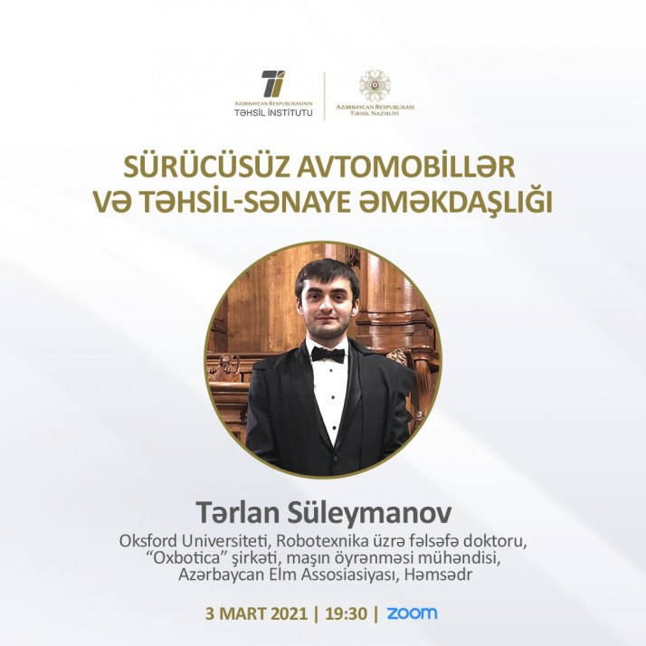 Azərbaycan Respublikasının Təhsil İnstitutu Sizi, 3 mart 2021-ci il, saat 19:30-da keçiriləcək “İş dünyası və ali təhsildə trendlər” vebinarlar silsiləsinin “Sürücüsüz avtomobillər və təhsil-sənaye əməkdaşlığı” adlı növbəti tədbirində iştirak etməyə dəvət edir.