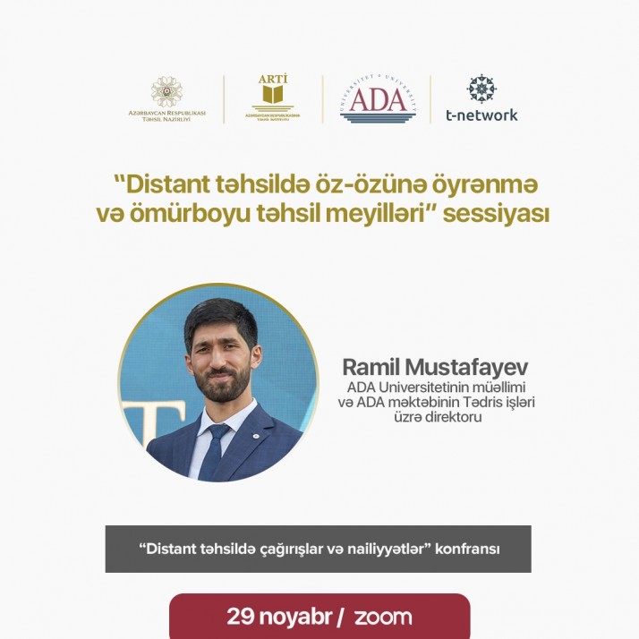 Sözügedən konfransın gündəliyində “Distant təhsildə öz-özünə öyrənmə və ömürboyu təhsil meyilləri” sessiyası yer alacaq. Sessiya zamanı ADA Universitetinin müəllimi Ramil Mustafayev distant təhsilin insanların şəxsi inkişafında rolu və ömürboyu təhsildə açdığı imkanlar haqqında çıxış edəcək və mövcud sualları cavablandıracaq.