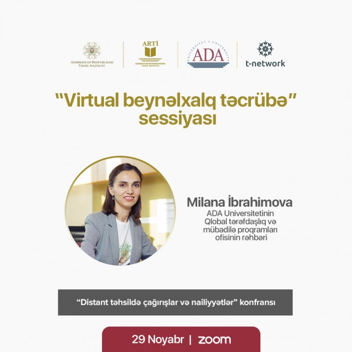 Sözügedən konfransın gündəliyində “Virtual beynəlxalq təcrübə” sessiyası yer alacaq. Sessiya zamanı ADA Universitetinin Qlobal tərəfdaşlıq və mübadilə proqramları ofisinin rəhbəri Milana İbrahimova pandemiya zamanı virtual (hibrid) formatda mübadilə proqramlarının təşkili, əldə olunan uğurlar, bu sahədə ən yaxşı təcrübələr, pandemiya zamanı əcnəbi tələbələrlə iş və onlar üçün təşkil olunan dəstək tədbirləri haqqında çıxış edəcək və mövcud sualları cavablandıracaq.