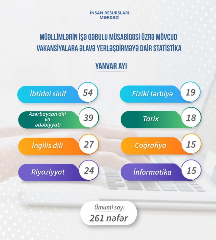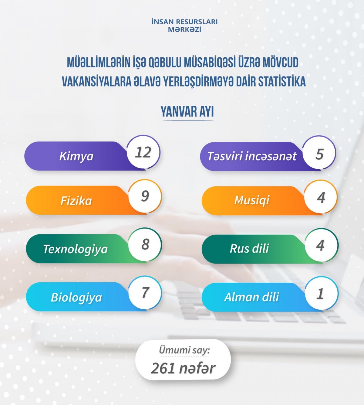 Müəllimlərin işə qəbulu müsabiqəsi üzrə yanvar ayı ərzində həyata keçirilən əlavə yerləşdirmə mərhələsində müvafiq vakansiyalara 261 nəfər işə qəbul olunaraq müəllim kimi fəaliyyətə başlamaq imkanı əldə edib.