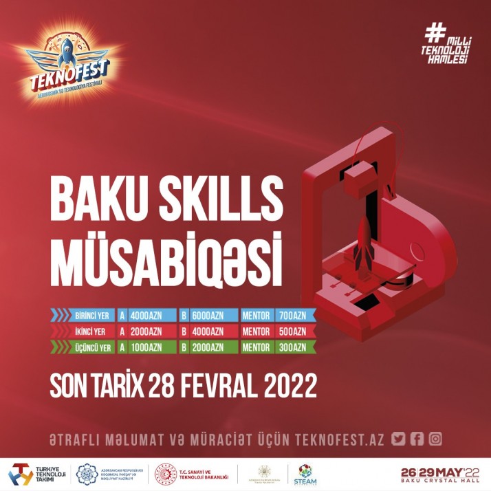 Cari ilin 26-29 may tarixlərində Azərbaycanda Türkiyənin ən böyük texnologiya festivalı olan “Teknofest” əsasında “Teknofest Azərbaycan” festivalı təşkil olunacaq. “Teknofest Azərbaycan” tədbiri çərçivəsində keçirilən “Baku Skills” kateqoriyası üzrə müsabiqə Təhsil Nazirliyinin və ARTİ-nin dəstəyi ilə “STEAM Azərbaycan” layihəsi tərəfindən təşkil olunur. “Baku Skills” müsabiqəsi iştirakçıların 3D çap texnologiyasında istifadə bacarıqlarının təkmilləşdirilməsini hədəfləyir. “Baku Skills” (3D modelləşmə, 3D çap) kateqoriyası üzrə yarışmada iştirak etmək hüququ qazanmış komandalar üçün lazımi avadanlıq və ləvazimat təchizatı Təhsil Nazirliyi tərəfindən həyata keçiriləcək. 1-ci, 2-ci və 3-cü yerlərin sahibi olacaq komandalar və onların rəhbərləri üçün pul mükafatları nəzərdə tutulub.