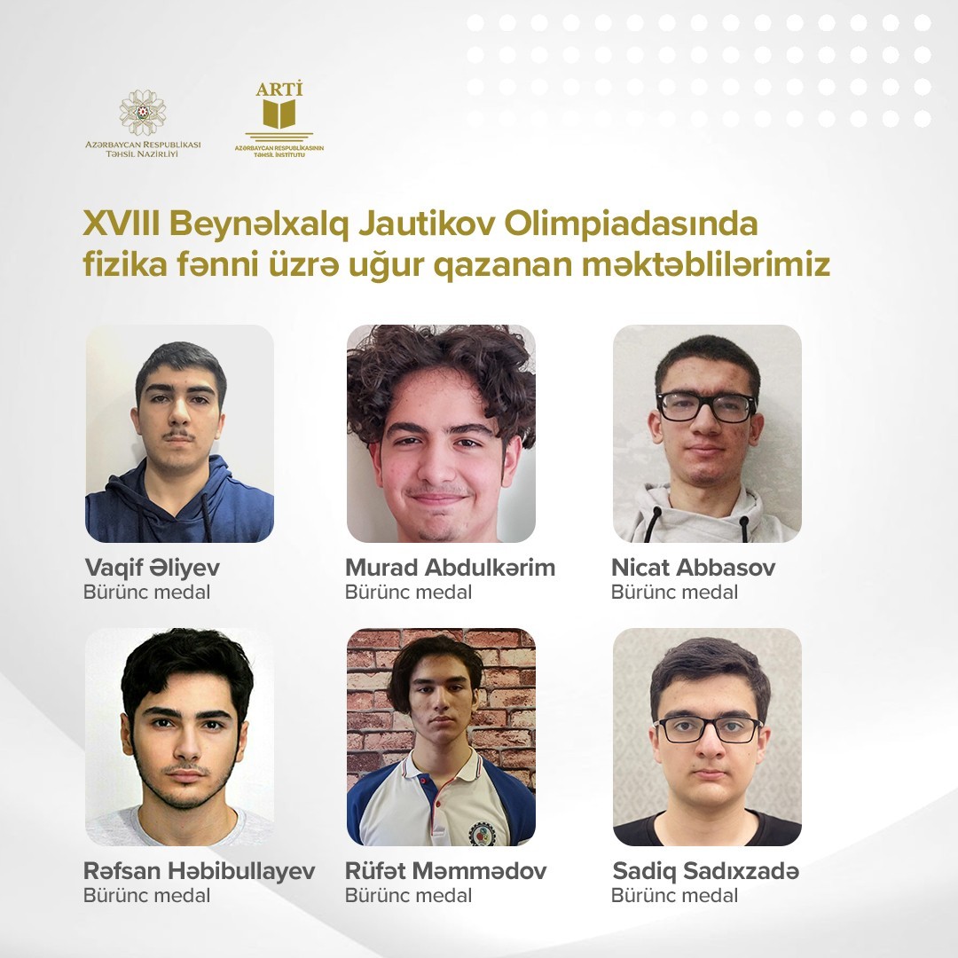 Fizika fənni üzrə Təhsil Nazirliyinin tabeliyindəki Fizika, riyaziyyat və informatika təmayüllü liseyin 10-cu sinif şagirdləri Sadiq Sadıxzadə və Murad Abdulkərim bürünc, həmin liseyin 11-ci sinif şagirdi Rüfət Məmmədov bürünc, həmçinin Türkiyə Dəyanət Vəqfi Bakı Türk liseyinin 10-cu sinif şagirdi Nicat Abbasov bürünc, Bakı şəhəri 147 nömrəli texniki-humanitar liseyin 11-ci sinif şagirdi Vaqif Əliyev bürünc, BDU nəzdində “Gənc istedadlar” liseyinin 11-ci sinif şagirdi Rəfsan Həbibullayev bürünc medala layiq görülüb.