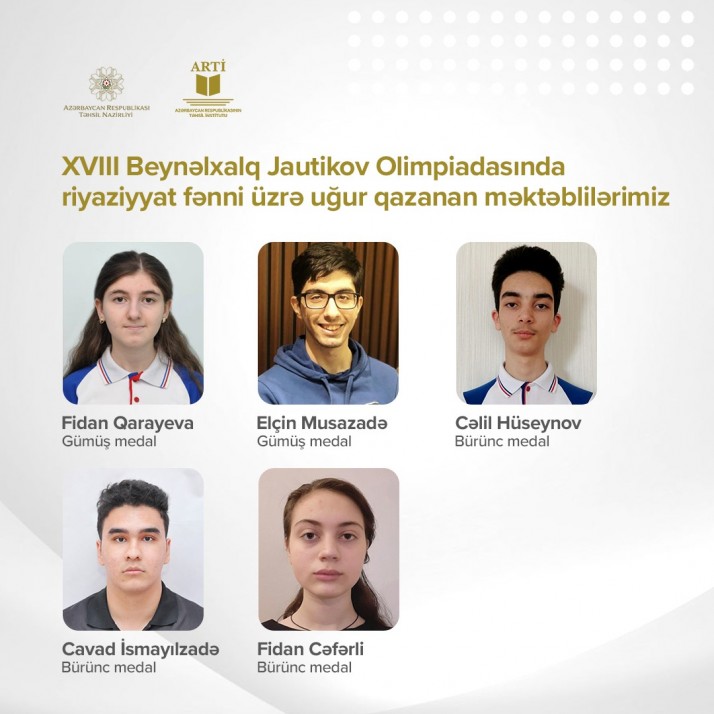 Riyaziyyat fənni üzrə Təhsil Nazirliyinin tabeliyindəki Fizika, riyaziyyat və informatika təmayüllü liseyin 10-cu sinif şagirdi Fidan Qarayeva gümüş, həmin liseyin 10-cu sinif şagirdi Cəlil Hüseynov bürünc, Bakı şəhəri 2 nömrəli texniki-humanitar liseyin 11-ci sinif şagirdi Elçin Musazadə gümüş, Bakı şəhəri 72 nömrəli orta məktəbin 11-ci sinif şagirdi Cavad İsmayılzadə bürünc, Türkiyə Dəyanət Vəqfi Bakı Türk liseyinin 10-cu sinif şagirdi Fidan Cəfərli bürünc medal qazanıb.