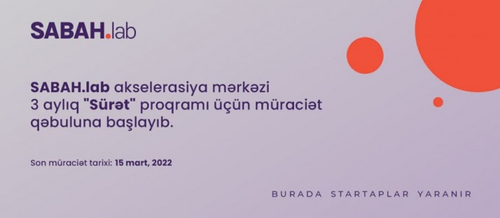 “SABAH.lab” Akselerasiya Mərkəzi 3 aylıq “Sürət” proqramına qəbul elan edir. Formalaşmış ideya və komandası, minimum mümkün məhsulu və orta səviyyə ingilis dili biliyi olan namizədlər “Sürət” proqramında iştirak edə bilər.