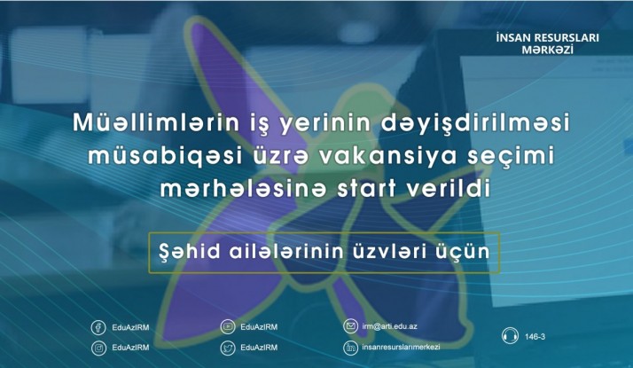 Bu gündən etibarən müəllimlərin iş yerinin dəyişdirilməsi müsabiqəsinin vakansiya seçimi mərhələsinə start verilir. İlkin vakansiya seçimi mərhələsində Təhsil Nazirliyi sisteminə daxil olan dövlət ümumi təhsil müəssisələrində işləyən şəhid ailələrinin üzvləri iştirak edəcəklər. Namizədlər şəxsi səhifələrinə daxil olaraq vakant yer seçimi edə bilərlər. Müəllimlərin iş yerinin dəyişdirilməsi müsabiqəsi üzrə vakansiya seçimi birinci mərhələdə 14 may saat 11:00-dək davam edəcək.