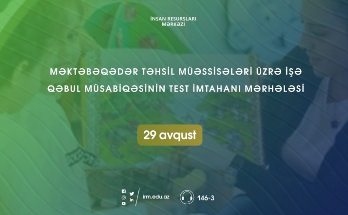 29 avqust tarixində məktəbəqədər təhsil müəssisələrinə tərbiyəçi-müəllimlərin işə qəbulu üzrə müsabiqənin test imtahanı mərhələsinə start veriləcək. Belə ki, 5488 nəfər namizədin iştirakı planlaşdırılan müsabiqə Bakı, Sumqayıt, Gəncə, Yevlax, Mingeçevir şəhərləri və Salyan rayonu olmaqla, ümumilikdə 9 imtahan mərkəzində təşkil olunacaq.