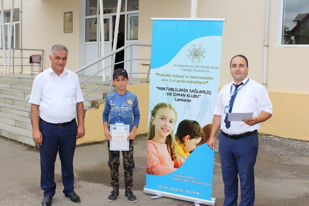 Təhsil Nazirliyinin elan etdiyi “Təhsildə inkişaf və innovasiyalar üzrə 2-ci qrant müsabiqəsi”ndə fərdi kateqoriya üzrə qalib olmuş Lənkəran rayonu, Tükəvilə kənd tam orta məktəbinin Coğrafiya müəllimi Samir Salayevin “Məktəblilərin sağlamlıq və idman klubu” layihəsi uğurla başa çatdı.