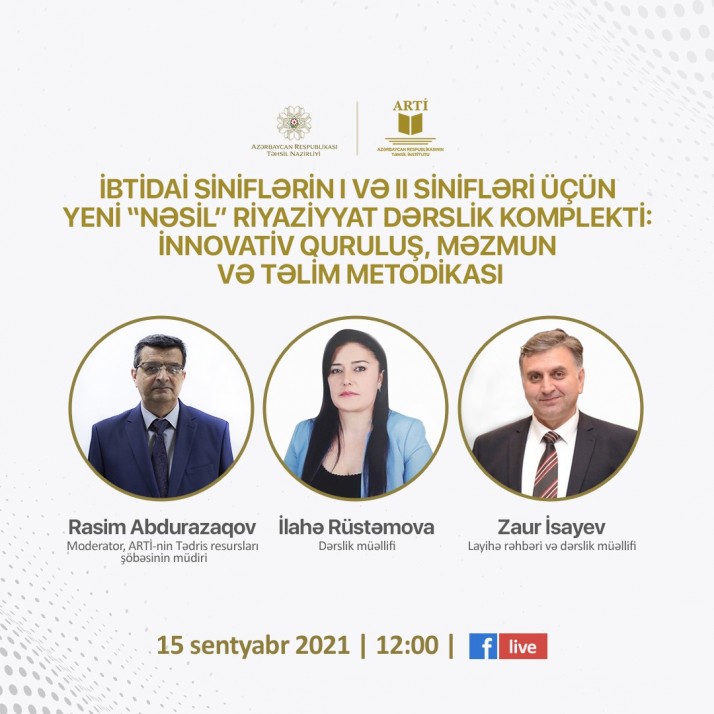 ARTİ 15 sentyabr saat 12:00-da “İbtidai siniflərin I və II sinifləri üçün yeni “nəsil” Riyaziyyat dərslik komplekti: innovativ quruluş, məzmun və təlim metodikası” adlı vebinar təşkil edəcək.