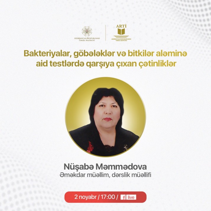 Növbəti vebinar 2 noyabr saat 17:00-da “Bakteriyalar, göbələklər və bitkilər aləminə aid testlərdə qarşıya çıxan çətinliklər” mövzusunda keçiriləcək. Vebinarda spiker qismində əməkdar müəllim, “İlin ən yaxşı müəllimi” müsabiqəsinin qalibi, dərslik müəllifi, “Tərəqqi” medalına layiq görülmüş Nüşabə Məmmədova çıxış edəcək.
